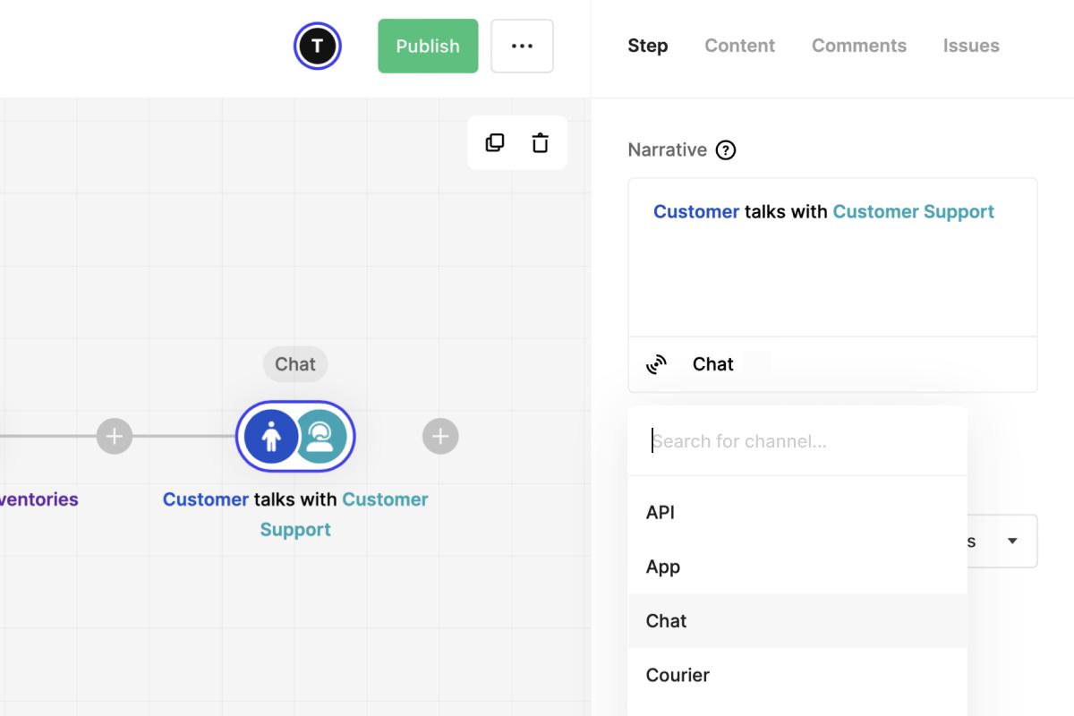 When you need to describe how the actors in a step communicate, you can do this by adding a channel. This can e.g be an API, a phone call, or a meeting.
