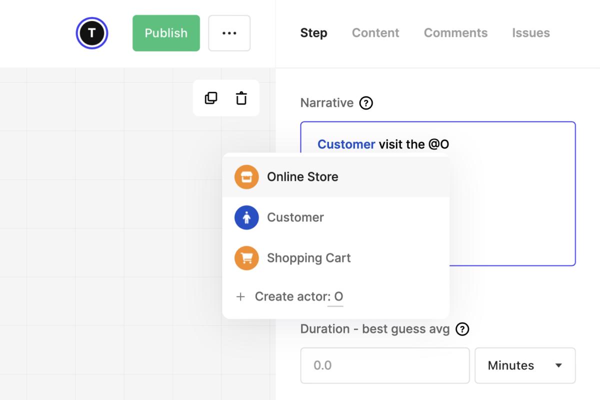 Good narratives are key to better flows. Every step need to describe who does what and how. To keep track of all the actors performing different actions in your flows, you can tag these systems, people, roles and more in your narrative and reuse them across your workspace.
